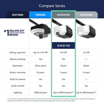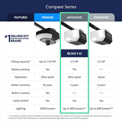 Lighting Drive Type Battery Backup myQ Compatibility Field of View Soft Start/Stop